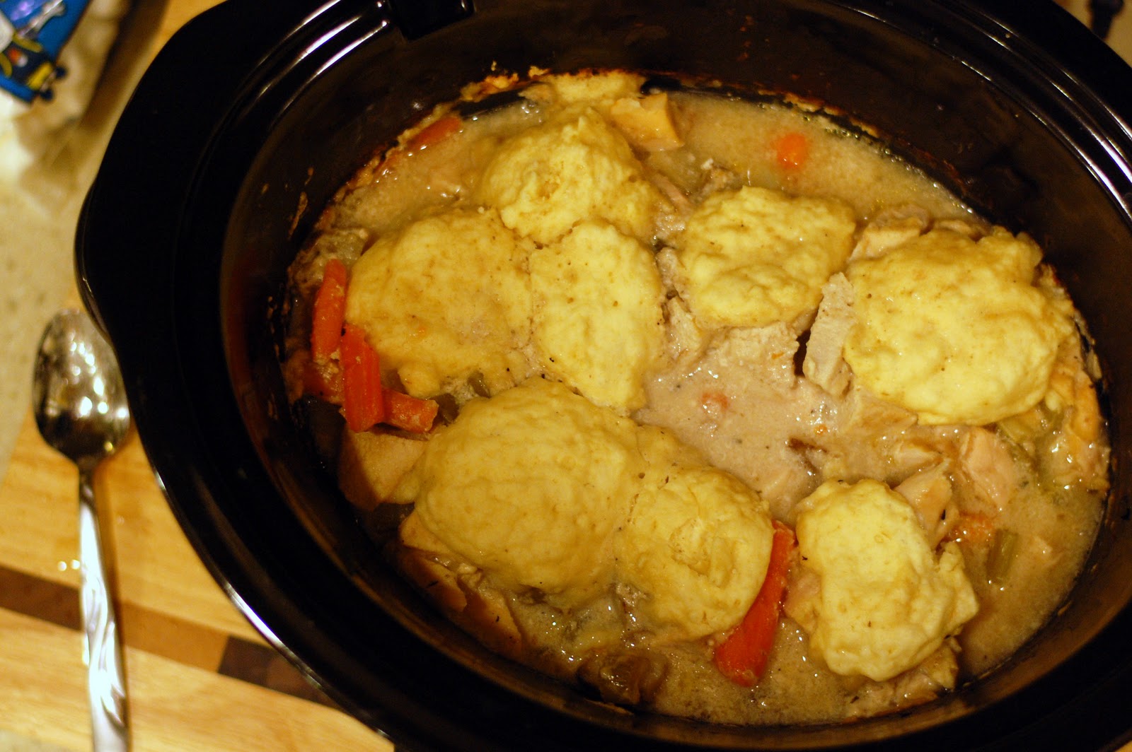 Oh, and a small word about the actual dish we ate... I don't recall ever eating chicken and dumplings before. Chicken pot pie, sure... but not chicken and dumplings (Mom, I'm sure you can confirm or deny this for me) and I have to tell you this was mighty tasty! Creamy, bready goodness. All of the great things about pot pie and biscuits and yummy warmth radiating from this dish. Mmmm!